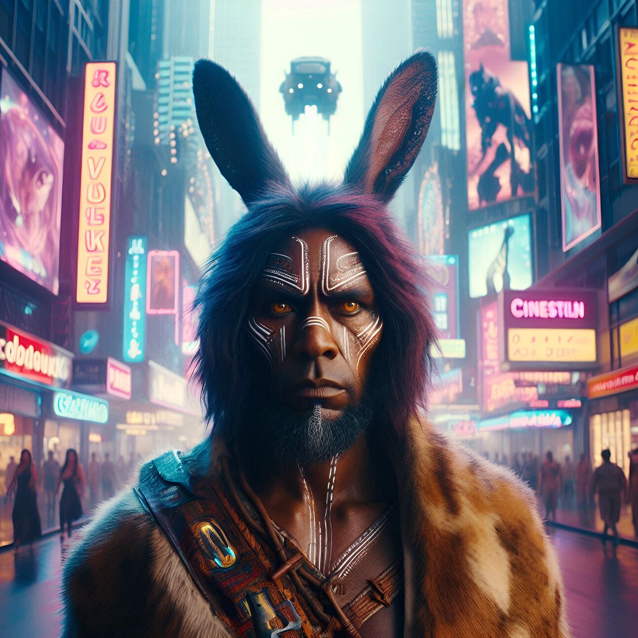 As he wandered through the bustling streets of 2080 Sydney, he attracted curious stares. His traditional attire seemed alien amidst the sea of synthetic fabrics and metallic hues. Pemulway's eyes darted from one marvel to the next, absorbing the strangeness around him. Hovercrafts zipped through the sky, and pedestrians moved in synchronized flows, their eyes glued to augmented reality displays. The city was alive with a pulse that seemed both mechanical and organic, a hybrid beast of steel and light.